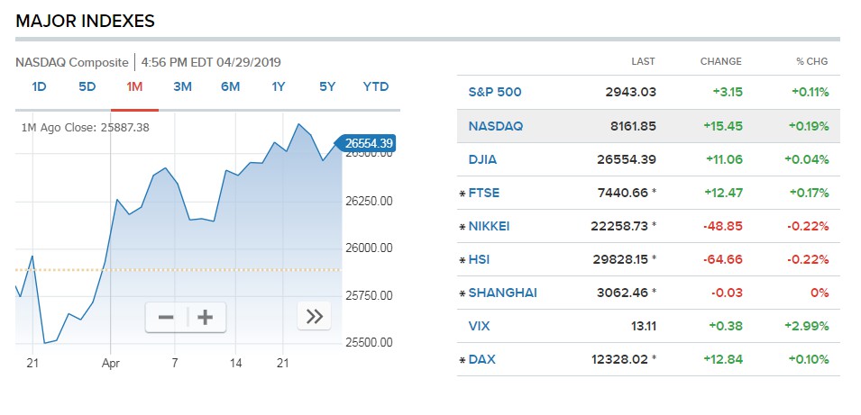 The tech-heavy Nasdaq Composite also hit an all-time high, rising 0.2% to 8,161.85. The Dow Jones Industrial Average closed 11.06 points higher at 26,554.39 as Goldman Sachs outperformed.